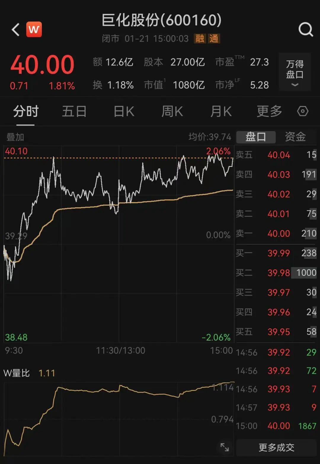 1月21日,巨化股份股价上涨1.81%,报40元/股,市值达1080亿元。