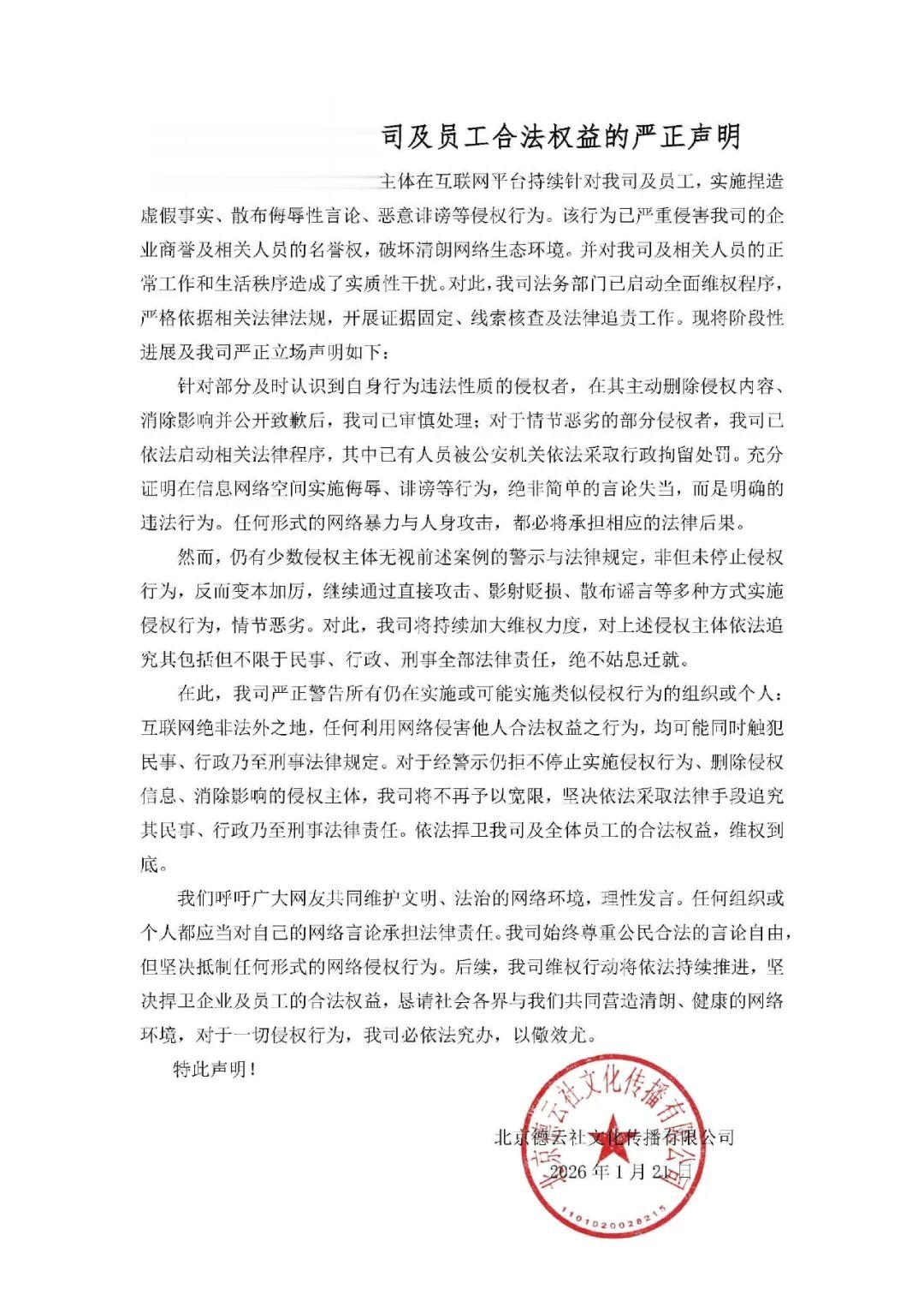 针对部分及时认识到自身行为违法性质的侵权者,在其主动删除侵权内容、消除影响并公开致歉后,我司已审慎处理;对于情节恶劣的部分侵权者,我司已依法启动相关法律程序,其中已有人员被公安机关依法采取行政拘留处罚。这充分证明在信息网络空间实施侮辱、诽谤等行为,绝非简单的言论失当,而是明确的违法行为。任何形式的网络暴力与人身攻击,都必将承担相应的法律后果。