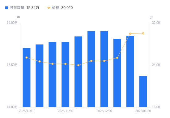 日期A股户数(户)流通A股户均持股数(股)户均持股市值(万元)2026-01-2015839417505.2552.552026-01-0918229215210.3545.592025-12-3118061515351.5838.962025-12-2018511914978.0737.132025-12-1918511914978.0737.132025-12-1018199315235.3436.522025-11-3017875715511.1537.582025-11-2817875715511.1537.582025-11-2017722815644.9738.632025-11-1017515615830.0440.26