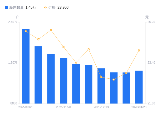 日期A股户数(户)流通A股户均持股数(股)户均持股市值(万元)2026-01-20144767260.4417.392026-01-09140997454.5817.112025-12-31141157446.1316.872025-12-19149337038.2516.032025-12-10155836744.6616.192025-11-28158146646.1415.562025-11-20169096215.7514.982025-11-10177525920.5814.712025-10-31192655455.6013.332025-10-20227054629.0311.48