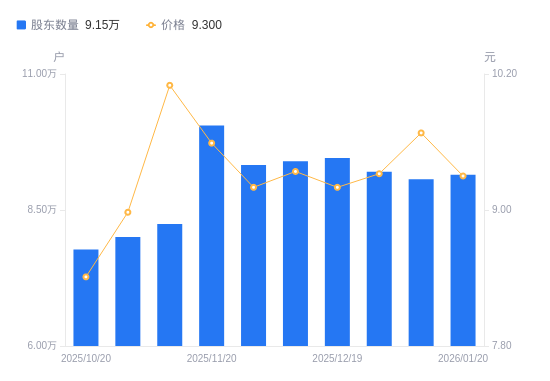 日期A股户数(户)流通A股户均持股数(股)户均持股市值(万元)2026-01-209149025581.5223.792026-01-099067125812.5924.992025-12-319202225433.6223.702025-12-199454524754.9122.772025-12-109397724904.5323.262025-11-289326925093.5823.092025-11-2010052823281.6022.332025-11-108241328399.0728.682025-10-318002929245.0626.262025-10-207775530100.3525.31