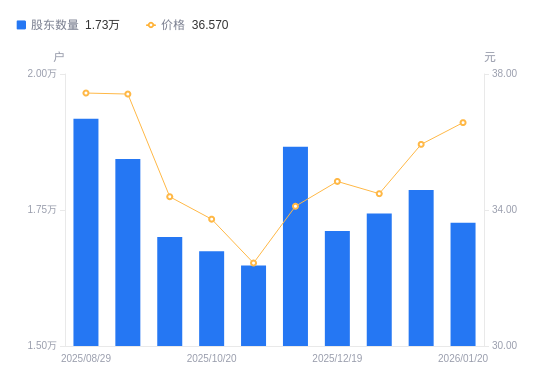 日期A股户数(户)流通A股户均持股数(股)户均持股市值(万元)2026-01-20172676949.6725.412026-01-09178686715.9224.132025-12-31174366882.3123.732025-12-19171147011.8024.432025-11-28186626430.1821.932025-11-10164827280.6723.622025-10-20167447166.7524.172025-09-30170037057.5824.272025-09-19184376508.6524.352025-08-29191786257.1723.43