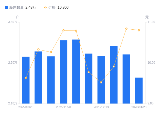 日期A股户数(户)流通A股户均持股数(股)户均持股市值(万元)2026-01-202481314212.2415.352026-01-102823512489.7613.542025-12-312947011966.3511.862025-12-192803212580.2011.982025-12-102836912430.7612.142025-11-283042811589.6012.512025-11-203033411625.5112.562025-11-102795512614.8612.942025-10-312867512298.1112.702025-10-202789012644.2612.18