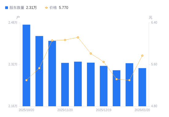 近一年(2025年1月27日至2026年1月20日),如意集团A股股东户数从3.96万户,减低至2.31万户,降幅41.74%,区间股价下跌6.03%。