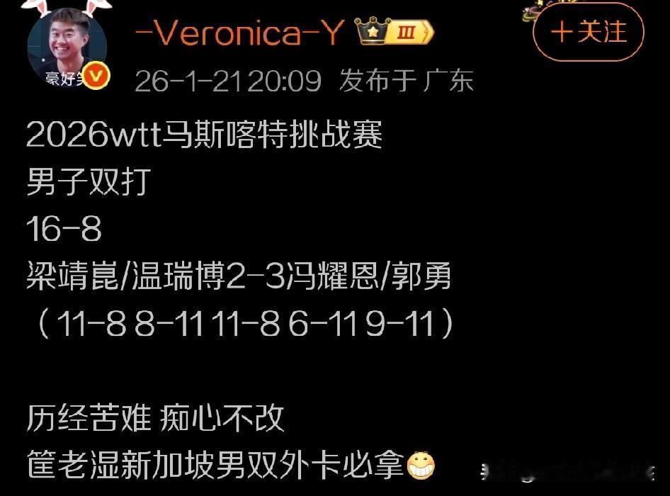 尽管多哈挑战赛的赛场上温瑞博作为国乒重点打造的一位潜力派小将,在多位实力派高手没有被派去参赛,或者在比赛当中表现不佳提前出局的情况下顶住压力,最后和周启豪实现了男单决赛场上的胜利会师,并拼下一个宝贵的亚军。但是来到WTT马斯喀特站的比拼当中,他和大胖梁靖崑组成的男双组合,还是在16进8的争夺战当中,面对来自新加坡的外卡组合冯耀恩和郭勇没能在一上来先赢一局,后面还2:1大比分占优的情况下,拿到比赛的最后胜利——遭遇了一场2:3的五局惜败。双方五局的具体比分是11:8,8:11、11:8,6:11和9:11。 对于这场比赛的比拼过程及结果,相信很多球迷也意识到了,当温瑞博开始打出一些个人价值,还有比赛当中的竞争力,其实对手往往也会在看到他的成绩提升之后,把自身的位置摆的更正,敢于去拼他和梁靖崑这种世界知名高手,而一旦对方拼的很凶的时候,温瑞博和梁靖崑这两位球员场上稳定性不足,起伏有点明显,失误率偏高的问题就会暴露出来。 特别是温瑞博,在这场比赛的第五局最后关键时刻也是连续出现了失误。另外梁靖崑在比赛中打的也显得中规中矩。具体一点说,拼硬实力大胖有时候失误率偏高,拼技巧又显得不够具备真正的控场能力还有比赛把控力。也让新加坡搭档有了在这场强强对话当中实现后来居上3:2五局险胜的机会。 我们也不得不说,在男女双打项目重新回到奥运参赛项目当中之后,外协会对这个项目都非常重视,也都把它当成奥运争冠的突破口。再加上国乒培养男双组合,为奥运备战争取选拔人才的过程中,也确实存在很多困难和问题,显然梁靖崑和温瑞博都还有很多的自身问题包括配合默契度问题还有打法合理性问题需要解决。即使他们在单打赛场上各自有过不俗表现,但要想在男双赛场上更进一步,并提升整体竞争力,还有很多的问题需要解决,我们也希望他们透过这样的失利,能在失败面前总结经验教训,以争取在未来的赛场上,可以在这个项目上有新的突破和成长!