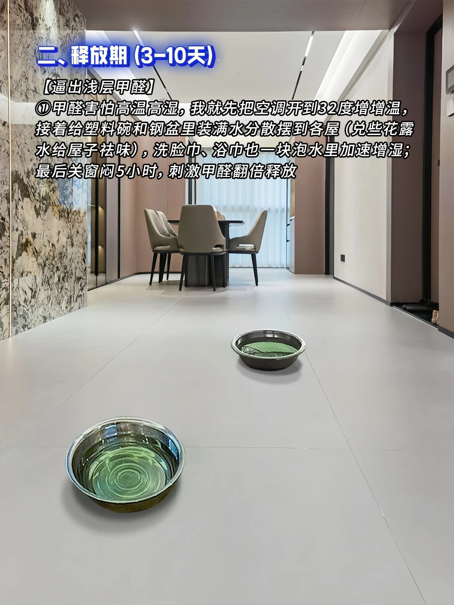 ①甲醛害怕高温高湿,我就先把空调开到32度增增温,接着给塑料碗和钢盆里装满水分散摆到各屋(兑些花露水给屋子祛味),洗脸巾、浴巾也一块泡水里加速增湿💦最后关窗闷5小时,刺激甲醛翻倍释放