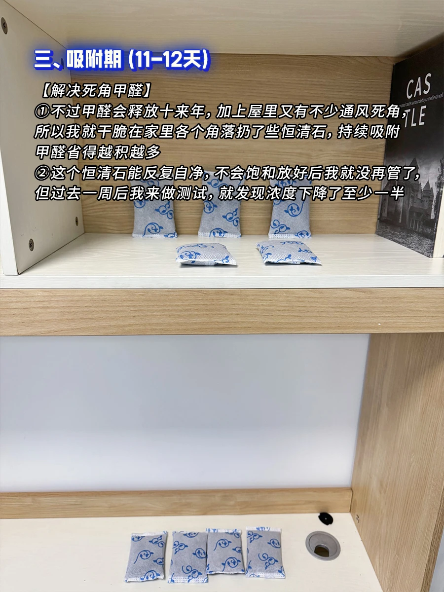 ①不过甲醛会释放十来年,加上屋里又有不少通风死角,所以我就干脆在家里各个角落扔了些恒清石,持续吸附甲醛省得越积越多