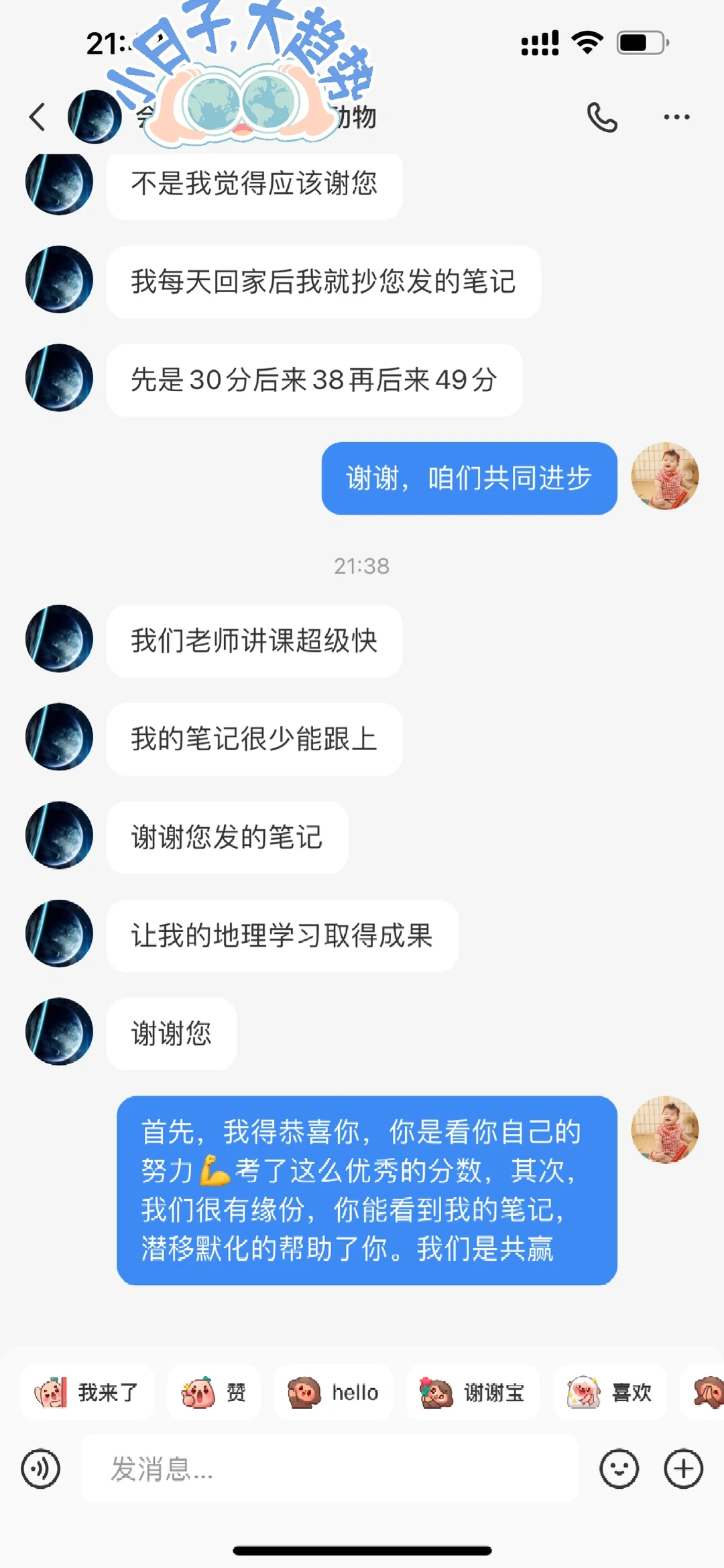 其实这不是我收到的第一个小温暖,但是这是一个比较意外的,因为他已经考完试成绩出来了,还来感谢我的。她应该谢谢的不是我,是那个放学回家后努力写笔记的她,是那个知道自己想进步的她。