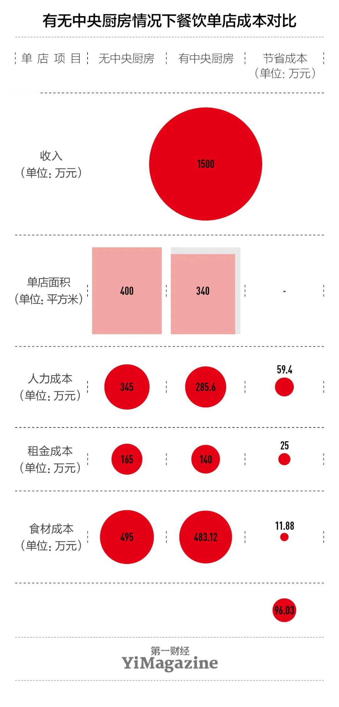 “300平方米的门店,后厨占30平方米,租金一天就要几千元。”同样较早尝试中央厨房模式的一家老牌中式快餐连锁品牌的总经理李楠对《第一财经》YiMagazine回忆。这家连锁品牌的第一家门店开在了北京的核心商圈,租金超过门店销售额的20%,而通常餐饮业的合理比例为10%至15%。为了节省成本,缓解租金压力,该品牌决定将后厨的部分功能转移出去以提升门店的出餐效率,于是在当时的北京市郊建设了第一个中央厨房。