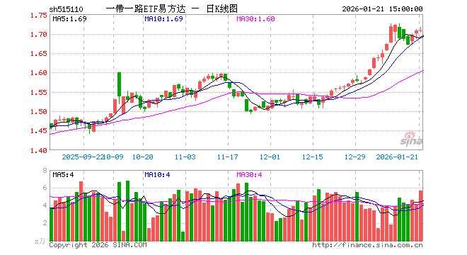 1月21日,一带一路ETF易方达(515110)涨0.06%,成交额967.59万元。当日份额增加100.00万份,最新份额为2.19亿份,近20个交易日份额减少100.00万份。最新资产净值计算值为3.75亿元。