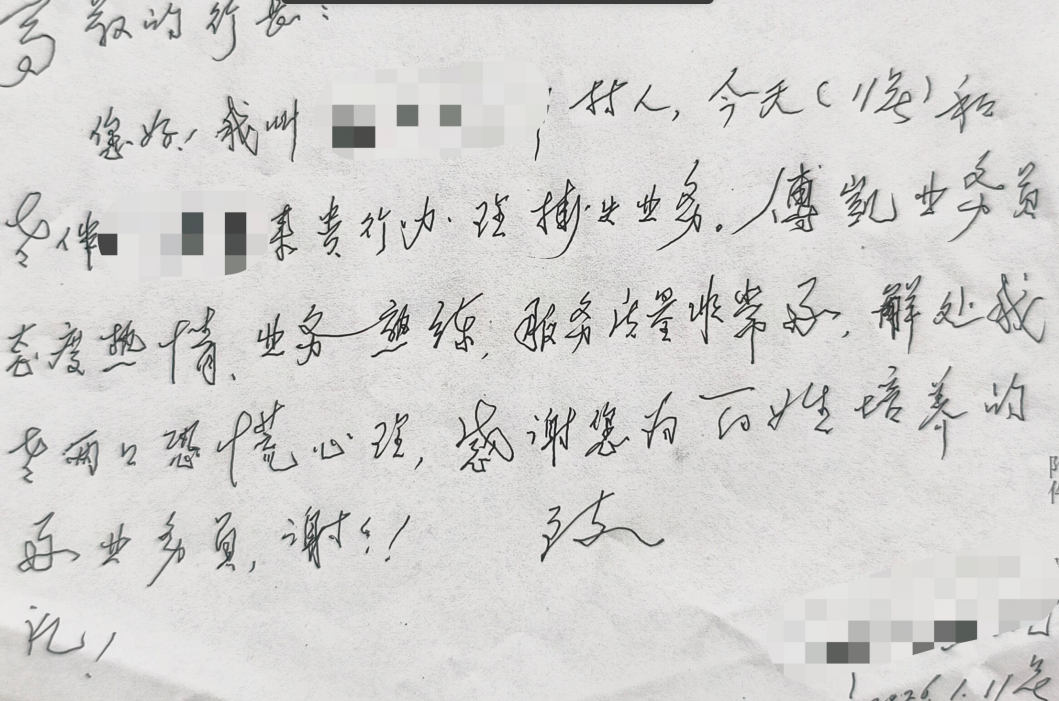 原来,张大爷的存单一直存放在家里,但近期收拾家务的时候老两口不知道把存单归置哪去了,也有可能混在旧书报里不小心给一起烧了,找了好几天也没找到,二老也是几宿都没睡好觉。经过系统查询,老两口确认其名下的十多张存单全部丢失。得知存单上面的钱都很安全,老人长舒了一口气。随后,傅凯积极协助两位老人到柜台办理了挂失补发业务。看着存单一张张被补发出来,二老心里的石头终于落了地,笑容也溢满脸庞。半小时后,十几张新存单全部补发完,拿着失而复得的存单,张大爷动情地拿起笔写下了这封情真意切的感谢信,以表达对烟台农商银行工作人员的感激之情。