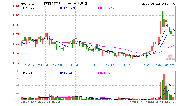 1月22日,软件ETF万家(560360)开盘涨0.59%,报1.699元。软件ETF万家(560360)重仓股方面,科大讯飞开盘涨0.88%,金山办公涨0.53%,同花顺涨0.38%,指南针涨0.06%,恒生电子涨0.59%,拓维信息涨0.00%,润和软件涨0.52%,三六零涨0.74%,软通动力涨0.56%。