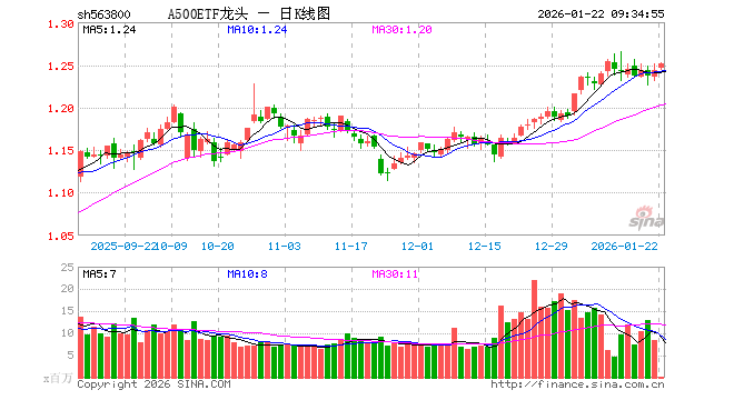 1月22日,A500ETF龙头(563800)开盘涨0.16%,报1.246元。A500ETF龙头(563800)重仓股方面,宁德时代开盘涨0.35%,贵州茅台涨0.07%,中国平安涨0.43%,招商银行涨0.08%,紫金矿业跌1.65%,新易盛涨0.12%,中际旭创涨1.41%,美的集团涨0.60%,东方财富涨0.00%,长江电力涨0.00%。