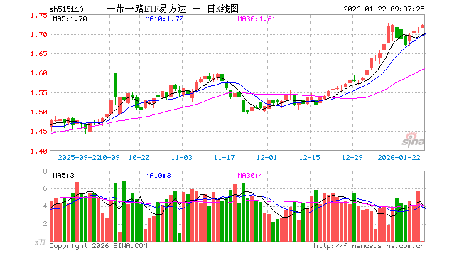 1月22日,一带一路ETF易方达(515110)开盘涨0.35%,报1.714元。一带一路ETF易方达(515110)重仓股方面,平高电气开盘涨0.00%,山东黄金跌4.02%,紫金矿业跌1.65%,中远海控涨0.07%,广东宏大涨0.10%,中国铝业涨0.00%,小商品城涨0.60%,中远海发涨0.00%,中海油服涨0.40%,云铝股份跌0.55%。