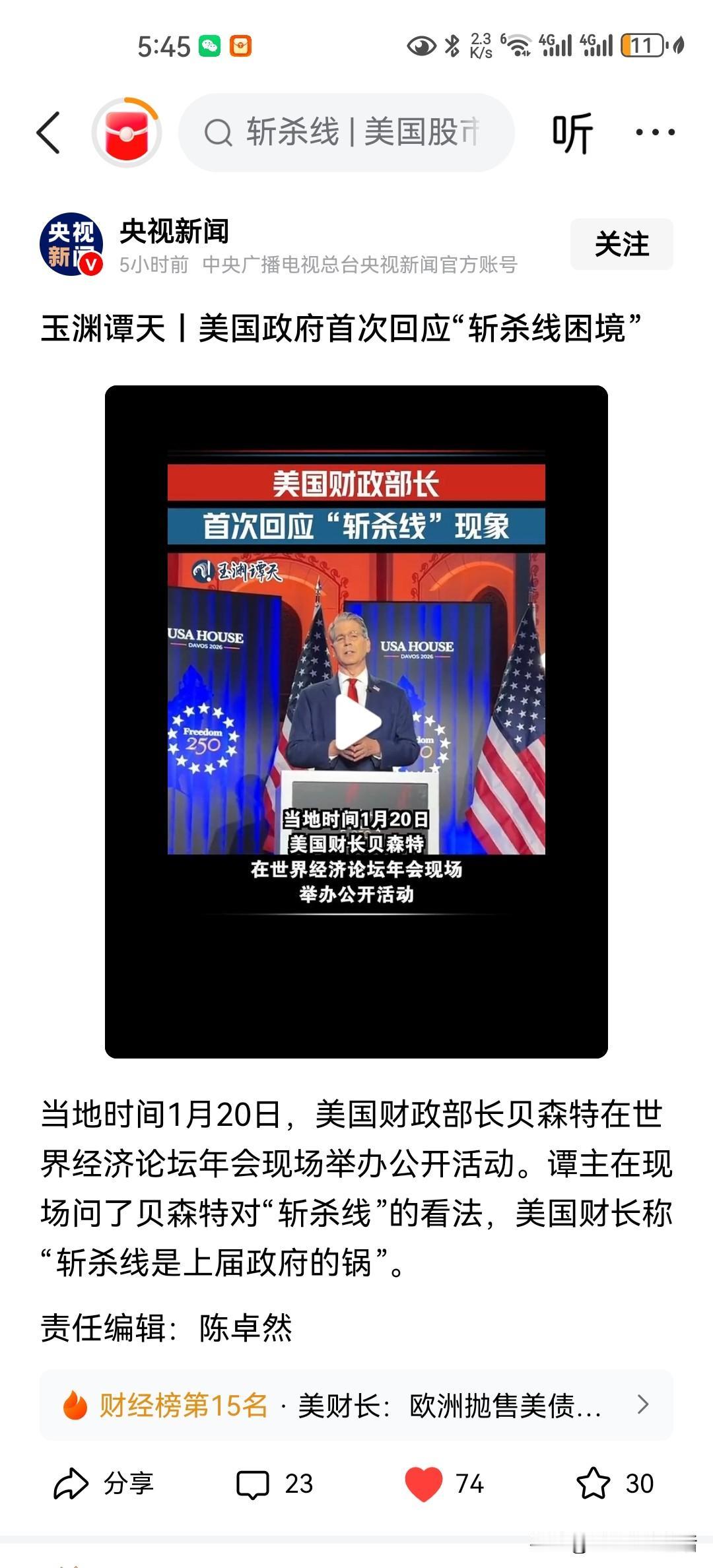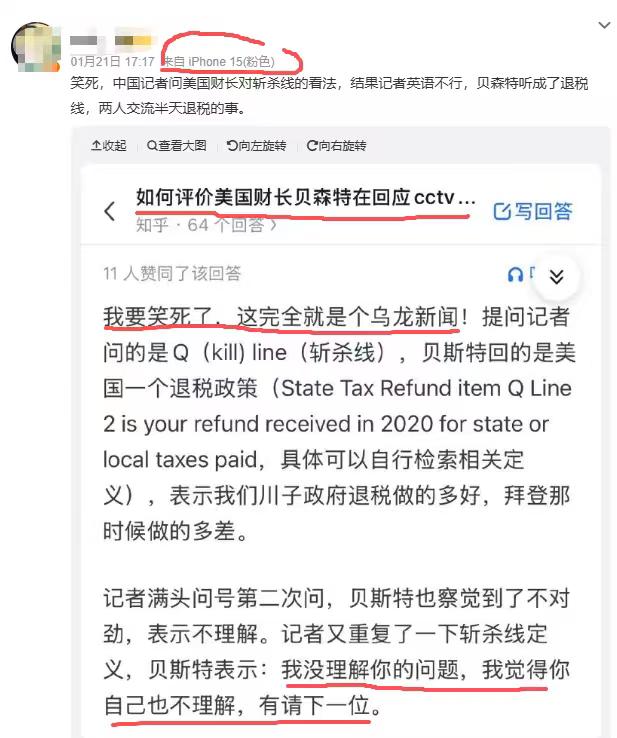 央视新闻转发玉渊谭天的关于提问美国财政部长“斩杀线”视频都敢有人喷记者的英语水平差,真不知道在心目中什么才叫好。 一看是用水果手机转发自知乎的帖子,大家就明白是怎么回事了,这种事就在正常不过了。 这位英语水平很高的博主也不行啊,现在水果都出17Pro了,它还用着15还是粉色的,看来不借这次活,是换不成17了,只能继续用它的15了,可惜大家不傻了,没几个人愿意听别人忽悠了。 就算这个记者英语水平真的不行,敢在这样的场合提问,也值得点赞。 他们以为的听不懂,会不会是不想听懂,或者是不敢听懂、不愿意听懂呢? 希望这些说美国多么好、多么自由的人,永远在那边幸福生活下去,千万不要回来和我争夺有限的资源。 也不要试图叫醒一个装睡的人,更不要试图扶起一个没有膝盖的人! 你觉得央视提问贝森特的那个记者的英语怎么样? 你听懂了吗?