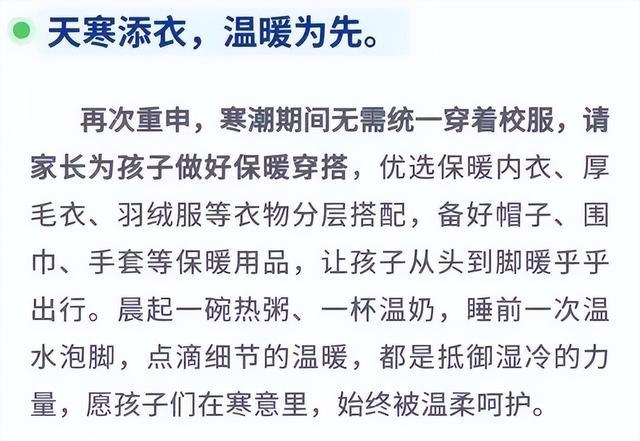 厦门市教育局21日发布《致全体学生及家长的寒潮温馨提示》,其中提到寒潮期间无需统一穿着校服,家长可为孩子做好保暖穿搭,内容如下:
