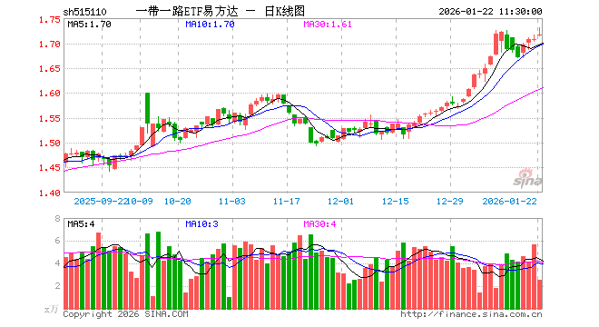 1月22日,截止午间收盘,一带一路ETF易方达(515110)涨0.53%,报1.717元,成交额441.44万元。一带一路ETF易方达(515110)重仓股方面,平高电气截止午盘跌1.33%,山东黄金跌4.12%,紫金矿业跌2.31%,中远海控涨0.21%,广东宏大涨0.12%,中国铝业跌1.04%,小商品城涨2.57%,中远海发涨1.15%,中海油服涨3.85%,云铝股份跌0.79%。