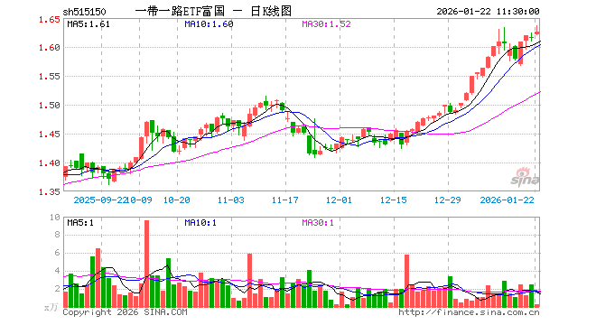 1月22日,截止午间收盘,一带一路ETF富国(515150)涨0.62%,报1.625元,成交额39.57万元。一带一路ETF富国(515150)重仓股方面,平高电气截止午盘跌1.33%,山东黄金跌4.12%,紫金矿业跌2.31%,中远海控涨0.21%,广东宏大涨0.12%,中国铝业跌1.04%,小商品城涨2.57%,中远海发涨1.15%,中海油服涨3.85%,云铝股份跌0.79%。