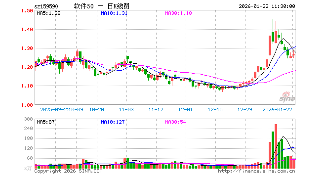 1月22日,截止午间收盘,软件50ETF(159590)涨0.96%,报1.265元,成交额6542.01万元。软件50ETF(159590)重仓股方面,科大讯飞截止午盘涨0.34%,同花顺跌0.61%,金山办公涨3.04%,指南针跌0.47%,恒生电子涨0.06%,润和软件涨0.65%,三六零涨0.33%,拓维信息涨0.09%,用友网络涨4.11%。