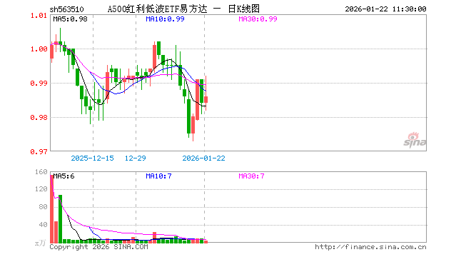 1月22日,截止午间收盘,A500红利低波ETF易方达(563510)涨0.20%,报0.986元,成交额411.88万元。A500红利低波ETF易方达(563510)重仓股方面,农业银行截止午盘跌2.16%,中国银行跌0.38%,云天化涨1.45%,雅戈尔涨1.09%,中国神华涨1.17%,交通银行跌0.30%,工商银行跌0.95%,江苏银行涨1.54%,中国石化涨3.36%,邮储银行涨0.00%。