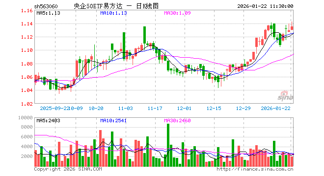1月22日,截止午间收盘,央企50ETF易方达(563060)涨0.53%,报1.135元,成交额22.21万元。央企50ETF易方达(563060)重仓股方面,长江电力截止午盘跌0.71%,中国神华涨1.17%,海康威视跌1.13%,中国建筑跌0.20%,中国电信涨0.17%,中国移动涨0.06%,国电南瑞跌1.68%,中国石油涨1.30%,中国中车跌1.17%,中远海控涨0.21%。