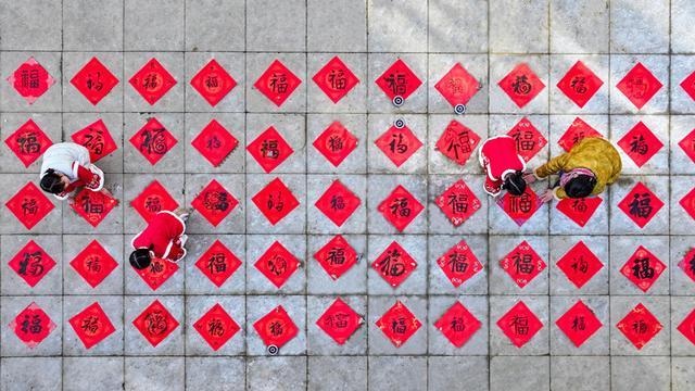 航拍展示环节将活动推向高潮。学生手持不同字体的福字,在美术与音乐教师的指导下,于操场定位贴区域协作拼摆福字图案。全体学生面向无人机航拍方向,齐声喊出“马到成功,新春快乐”口号,教师在方阵前排共同举“马到成功”横批呼应,形成红色衣袂方阵、福字拼图的震撼画面。