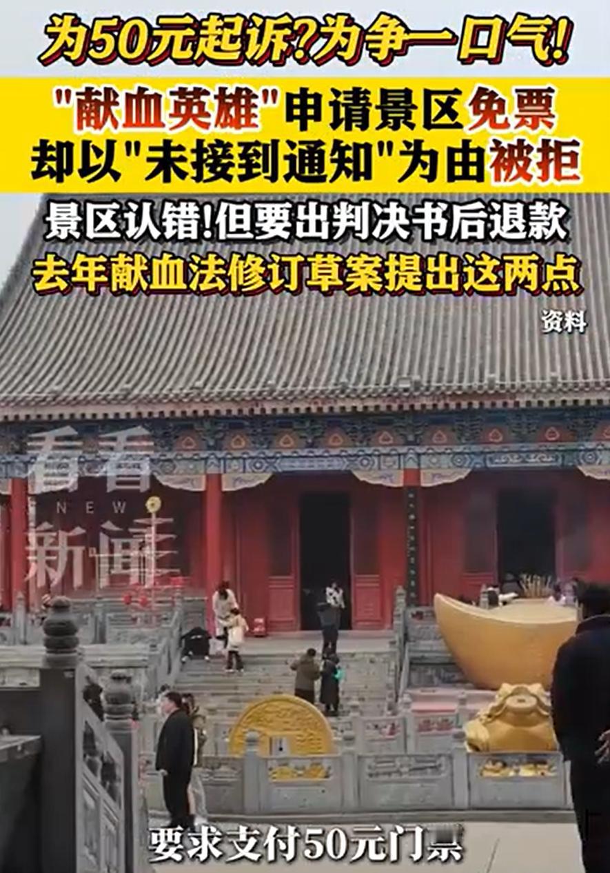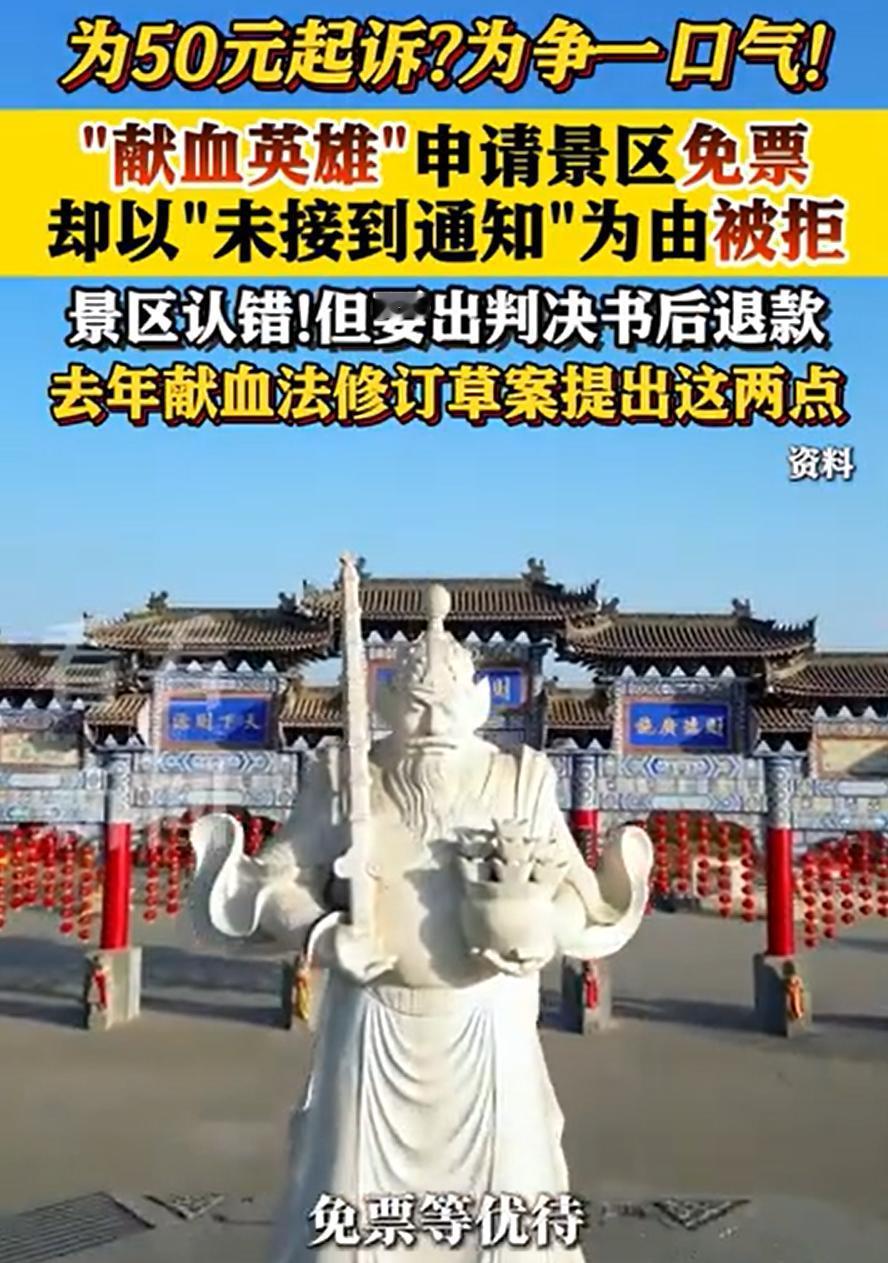 这下压力给到西安文旅了!陕西西安,一男子带着父母赵公明文化景区游玩,因为自己无偿献血达到2.2万毫升,符合免票标准,却被工作人员收了50元门票,男子将景区起诉,负责人虽然道了歉,但却表示:因财务流程要求,需待判决书出具后执行 吕先生是个长期坚持无偿献血的人,前前后后加起来已经献了57次,总量达到22600毫升。按照《西安市献血条例》的规定,他拿到了西安市无偿献血荣誉A卡,可以享受一些优待政策,其中就包括免费进入市属的A级景区 按理说,他带着父母去游玩,应该凭卡享受优待,但没想到,景区工作人员却要求他支付50元的门票,理由竟是“未接免票通知”! 事后,吕先生越想越觉得不对劲。这不仅仅是为了50块钱,更是觉得自己的权益,甚至所有献血者的荣誉,没有被尊重。于是,他一纸诉状,把景区的运营公司告上了法庭 说实话,西安出台政策奖励献血者,这是城市温度的体现,值得点赞。但再好的政策,如果到了具体执行的地方,比如某个景区售票处,工作人员一问三不知,或者说“没接到通知”,那这份初衷就被硬生生截留了 景区负责人当庭认错,态度是有了,但“等判决再退款”的说法,听上去总有点别扭。承认了错误,明确了该退钱,为什么不能简化流程,主动、尽快地处理呢?哪怕自己掏腰包退给对方50元又如何呢? 文旅体验的好坏,往往就由这些细节决定。一个景区对政策的执行是否到位,工作人员的服务意识如何,都关系到旅客的体验,这次确实没给大家留下一个好的印象