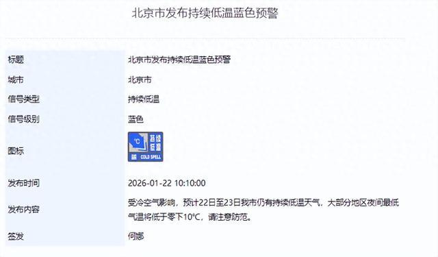 1月22日10:10,北京市发布持续低温蓝色预警:受冷空气影响,预计22日至23日我市仍有持续低温天气,大部分地区夜间最低气温将低于零下10℃,请注意防范。