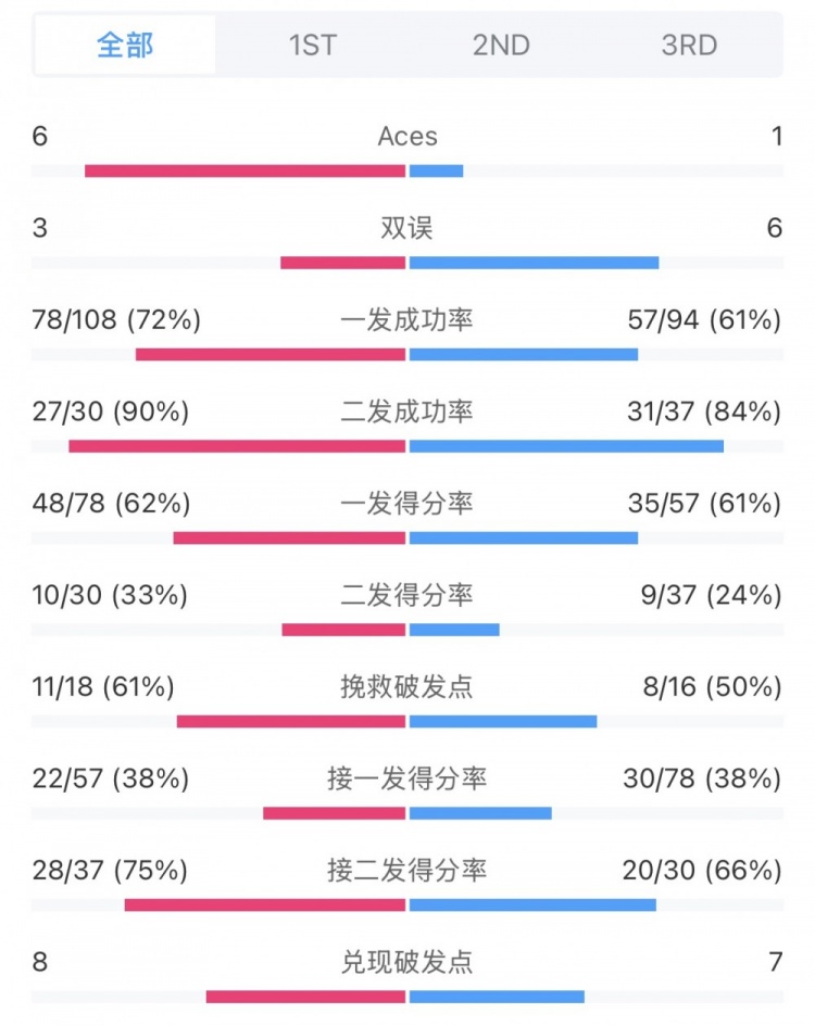 直播吧1月22日讯澳网女单第2轮,王欣瑜2-1逆转奥斯塔彭科首进32强,全场数据方面,王欣瑜发出6记Ace球。