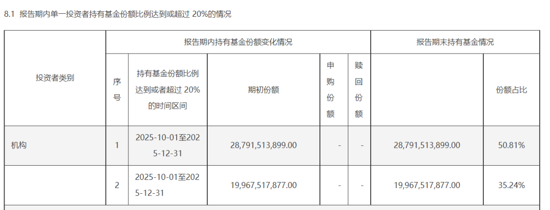 类似的还有华夏沪深300ETF。季报显示,截至去年底,机构1、机构2分别持有210.9亿份和209.37亿份,结合华夏沪深300ETF的2025年中期报告分析发现,机构1为中央汇金资产管理有限责任公司、机构2为中央汇金投资有限责任公司,合计持有420.28亿份。