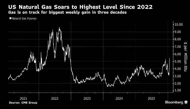 由于寒潮天气可能推高需求并影响供应,美国天然气期货飙升至2022年以来最高水平,短短三天内涨幅超过70%。近月合约上涨13%,至每百万英热单位5.506美元。此前两个交易日累计涨幅已达到50%,交易员争相将恶劣天气的影响计入价格。目前,天然气价格有望创下自1990年有记录以来的单周涨幅纪录。气温下降可能会扰乱美国南部的天然气生产,所谓的“冻融现象”(即管道内的水凝固)可能会影响供应,而与此同时,预计需求量将上升并将消耗库存。价格飙升可能带动大宗商品更广泛的上涨行情,会推高美国消费者的成本,而且还会对欧洲和亚洲产生连锁反应,因为这两个地区都依赖美国出口海外的液化天然气供应。这两个地区的寒潮也在推高天然气需求。