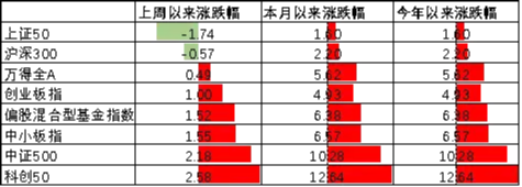 上周主要板块有所上行,其中上证50跌1.74%,跌幅最大;科创50涨2.58%,涨幅最大。央行下调再贷款利率叠加国内出口及贷款数据走强带动市场情绪上行,在此背景下A股出现了一定的上行。偏股基金指数涨1.52%。