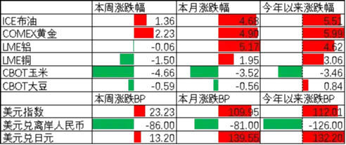 上周各类期货价格有所震荡,其中黄金涨幅最大,玉米跌幅最大。ICE布油收于64.2美元,涨1.36%,COMEX黄金收于4601.1美元,涨1.36%。