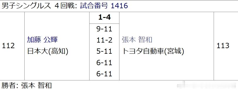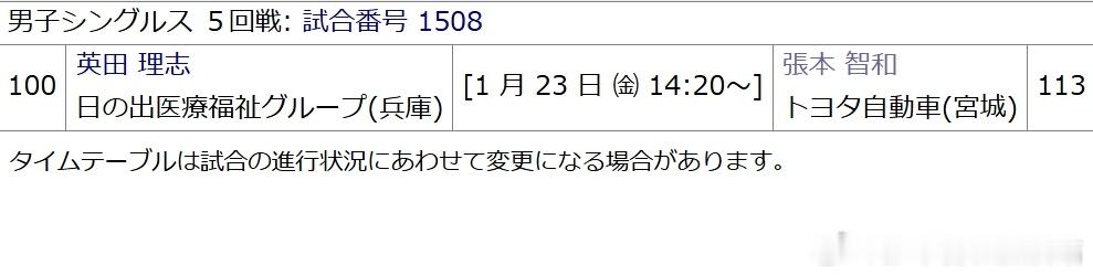 乒乓球全日锦2026张本智和 260122 第4轮张本智和 4:1 加藤公辉 (9,-2,5,6,6)260123 第5轮英田理志 Vs. 张本智和北京时间13:20 桌号15 编号1508观看链接: 网页链接