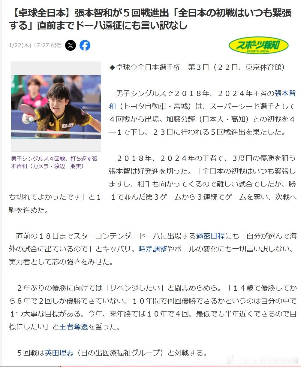 乒乓球全日锦2026张本智和 【日媒】“《【全日本乒乓球锦标赛】张本智和晋级第五轮,坦言 “全日锦首战向来紧张”,多哈远征连战至赛前毫无借口》1 月 22 日(周四)17:27 发布体育报知◆乒乓球◇全日本锦标赛 第三个比赛日(22 日,东京体育馆)曾斩获 2018、2024 年赛事冠军的张本智和(丰田汽车・宫城)以头号种子选手身份从第四轮登场,在与加藤公辉(日本大学・高知)的首战中以 4-1 取胜,成功晋级将于 23 日进行的第五轮比赛。身为两届冠军、此番冲击生涯第三冠的张本智和,迎来了赛事的开门红。他赛后表示:“全日锦的首战向来会感到紧张,对手的进攻也很有冲击力,这场比赛打起来并不容易,能拿下胜利很开心。” 在双方战至 1-1 平后,张本从第三局开始连下三局,顺利拿下赛点晋级下一轮。直至 18 日还征战于多哈球星挑战赛,密集的赛程并未成为他的阻碍,他斩钉截铁地说道:“海外的赛事都是我自己选择参加的。” 面对时差调整、比赛用球差异等问题,他毫无半句借口,尽显顶尖选手的强大内心。对于冲击暌违两年的全日锦冠军,张本智和斗志昂扬:“我想要一雪前耻。” 他坦言:“14 岁夺冠后,过去 8 年里只拿下了两次冠军。我心里有个重要的目标,就是想看看自己 10 年间能拿下多少次全日锦冠军。如果今年、明年都能夺冠,10 年里就能拿到 4 次,这个目标至少还有近半年的时间去实现,我想把它定为努力的方向。” 一番话尽显重夺冠军的决心。张本智和将在第五轮迎战英田理志(日之出医疗福祉集团)。”(机翻)Cr: 报知新闻