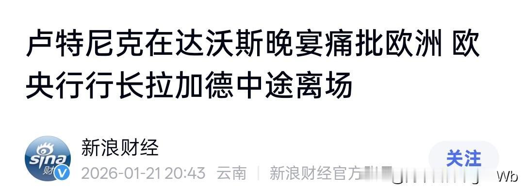 “背刺美国!”达沃斯晚宴上,美方官员的骂声刚落,欧洲央行行长拉加德带着七八位高官当场离席。 达沃斯甜点没上完,欧洲行长带头走人,卢特尼克一句话让全场冷场。这事不是嘴瓢,是真闹大了。特朗普政府里,话说得越狠,越容易被看见。 晚宴上卢特尼克骂欧盟“背刺美国”,还威胁要加税。拉加德当场起身,后面七八个欧洲高官跟着走,连咖啡都没喝完。主办方脸都绿了,赶紧收场。 这已经不是第一次了。去年万斯在慕安会说欧洲“堕落”,特朗普转头夸他敢讲。卢特尼克没当过政客,是华尔街来的,怕被踢出核心圈,急着刷存在感。 他去年搞了个“50%规则”,结果中国直接反制稀土出口,APEC缓和计划全泡汤。特朗普当面骂他“蠢货”。这次达沃斯,明显是想翻盘。 白宫现在谁管事?不是看职位,是看谁跟特朗普打球多、发推多、骂得狠。马斯克没官职,却能插手人事;球友威特科夫绕过国务卿谈俄乌。专业不重要,忠诚才是硬通货。 欧洲现在不吵了,也不急着回应,只是 静静地开始推自己的芯片计划、能源项目。该干啥干啥。 甜点没上完,席就散了。