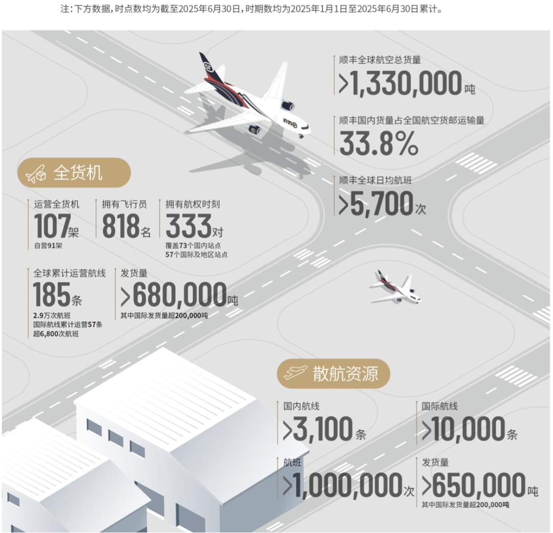 目前,作为国内物流龙头,其竞争力依然在于航空货运机队和国内中高端商务件网络。根据财报,截至2025年上半年,顺丰拥有中国最大、全球前列的货运航空公司,且为中国航空货运最大货主,期内,其国际发货量超20万吨。
