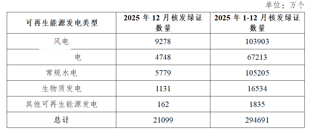 2025年12月,风电核发绿证9278万个,1-12月风电核发绿证103903万个。