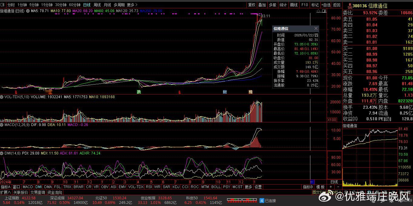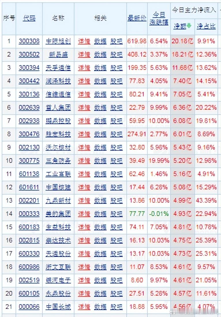 【财富晚茶】潜龙浮出水面:01.22主力资金:净流入前20股票导语:作者系《网易号》优质财经领域创作者。曾经原创作者和知名网易号旅游领域创作者。大跨度行业等的写作,颇受网友喜爱。作品发表于2026.01.22.15:18 优雅端庄晚风。【内容概述】今日股市收评:主题是:【财富晚茶】潜龙浮出水面:01.22主力资金:净流入前20股票。主旋律:今日主力资金:净流入前20股。主力投资潜龙浮出:越战越勇叠创新高。一、视野最新:主力资金:前20强股1、市场运作:涨幅前三300775 三角防务300136 信维通信002815 崇达技术2、观K线图:靓丽底牌第一、300775 三角防务靓丽底牌:国内航空航天锻件领域的龙头企业。全球大型模锻设备领域的领先企业。中国航发等军工集团的核心供应商。第二、300136 信维通信靓丽底牌:全球领先的卫星终端核心供应商。高端MLCC技术国内企业前列第三、002815 崇达技术靓丽底牌:国内PCB行业龙头。二、视野背景:资金为王:前20强股复盘潜龙:浮出水面追踪资金:沪深北市:净流入股票。市场资金:净流入板块:半导体产业链、贵金属板块领涨及相关行业领域。多重利好因素:包括宏观政策、产业需求、地缘政治和市场情绪共同作用的结果等。1、300308 中际旭创 收盘价:615.80元。涨跌幅:5.83%。净流入: 17.37亿2、300502 新易盛 收盘价:408.89元。涨跌幅:3.57%。净流入: 16.34亿3、300394 天孚通信 收盘价:199.52元。涨跌幅:5.72%。净流入: 10.66亿4、300136 信维通信收盘价: 80.58元。涨跌幅: 9.92%。净流入: 7.09亿5、300442 润泽科技收盘价:77.66元。涨跌幅: 3.82%。净流入: 6.91亿6、002639 雪人集团 收盘价:22.79元。涨跌幅:9.99%。净流入: 6.24亿7、002938 鹏鼎控股 收盘价:59.95元。涨跌幅:10.00% 。净流入: 5.87亿8、300476 胜宏科技 收盘价:274.40元。涨跌幅:2.58%。净流入: 5.56亿9、002130 沃尔核材 收盘价:32.82 元。涨跌幅:6.04%。净流入: 5.51亿10、300775 三角防务收盘价:39.49元。涨跌幅:19.99%。净流入: 5.05亿11、601611 中国核建收盘价:17.48元。涨跌幅:6.52% 。净流入: 5.03亿12、002201 九鼎新材 收盘价:13.86元。涨跌幅:10.00%。净流入: 4.97亿13、600330 天通股份收盘价:13.17元。涨跌幅:10.03%。净流入: 4.67亿14、002815 崇达技术 收盘价:16.13元。涨跌幅:10.03%。净流入: 4.64亿15、000333 美的集团收盘价:77.78元。涨跌幅:0.00%。净流入: 4.59亿16、002519 银河电子收盘价: 8.60元。涨跌幅:9.97%。净流入: 4.59亿17、600183 生益科技 收盘价:73.68元。涨跌幅:6.43% 。净流入: 4.56亿18、600372 中航机载 收盘价:16.58元。涨跌幅: 6.15%。净流入: 4.54亿19、600105 永鼎股份 收盘价:27.54元。涨跌幅:5.40%。净流入: 4.49亿20、600986 浙文互联 收盘价:11.11元。涨跌幅:8.92%。净流入: 4.41亿三、政策预热:国际因素:千丝万缕2026年1月21日收盘:市场呈现冲高回落、震荡分化态势,但整体小幅收红,市场情绪回暖。盘面之上:多个板块受到利好政策和市场信息的刺激而表现强劲,其中半导体产业链和贵金属板块领涨。1、利好刺激:半导爆发半导体产业链全线爆发:该板块是当日市场最强主线,透析如下:第一、观AI算力需求激增全球AI基础设施发展带动对内存芯片的强劲需求,市场预期存储芯片价格持续上涨,TrendForce预测2026年第一季度NAND Flash和DRAM价格将分别大涨33%-38%和55%-60%。第二、国产替代快马加鞭长江存储、长鑫存储等企业产能爬坡。设备与材料环节:例如中微公司、北方华创等公司订单饱满,国产化逻辑得到强化。2、业绩验证:机构加码多家半导体公司发布业绩预告,验证行业周期复苏,引发资金追捧。通富微电、佰维存储等个股获机构大额买入,龙虎榜显示机构净买入额超3亿元。3、观贵金属:延续强势贵金板块:延续强势:现货黄金站上4876美元/盎司、现货白银突破95美元/盎司,均创历史新高。因素推动:地缘政治紧张:例如格陵兰岛问题、中东局势、美联储独立性担忧,推升了黄金的避险属性。4、全球央行:持续购金通胀预期与货币属性:美元信用弱化、实际利率下行以及波兰央行等机构持续购金,为金价提供长期支撑。5、沪深北市:活跃板块板块之一:航天科技包括卫星互联网:马斯克表态希望在2026年7月前推动SpaceX上市,市场关注“数据中心上太空”概念,相关标的如中国卫星、航天电子等受到关注。板块之二:AI应用端机构调研;重点从算力硬件向应用落地场景扩散.AI+医疗、AI+营销:等等领域获得关注。但是需要:警惕部分概念股业绩证伪风险。板块之三:资源板块锂矿、油气等概念震荡反弹,资源类板块多点开花。6、高位杀跌:白酒银行形成对比:与上述板块:大消费板块:例如白酒、银行等:当日表现承压,出现集体走弱。这波行情:是宏观政策、产业需求、地缘政治和市场情绪共同作用的结果。这背后是:多重利好因素共同推动的结果。四:优质网易:抛砖引玉:财经作者投资投机迷茫之中:给予尽可能有帮助:资本市场风险自负。(优雅端庄晚风《网易号》优质财经领域创作者和原创作者; 违者必究)