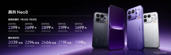 新浪科技讯1月22日晚间消息,真我手机正式发布165Hz潮玩电竞旗舰真我Neo8,提供赛博紫、起源白、机甲灰三款全新配色。首销立减200元,首销价2399元起,国补后到手价2039.15元起。另外,真我将于2026年4月正式接入OPPO售后体系。