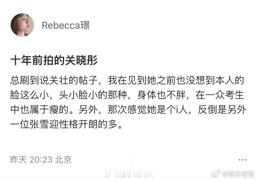 摄影师为关晓彤身材发声摄影师 Rebecca 璟在社交平台分享了 10 年前拍摄的细节,针对网络上 “关壮” 的争议发声,称本人头小脸小,身体并不胖,在一众考生里也属于偏瘦的类型彤姐被审判的这些年....