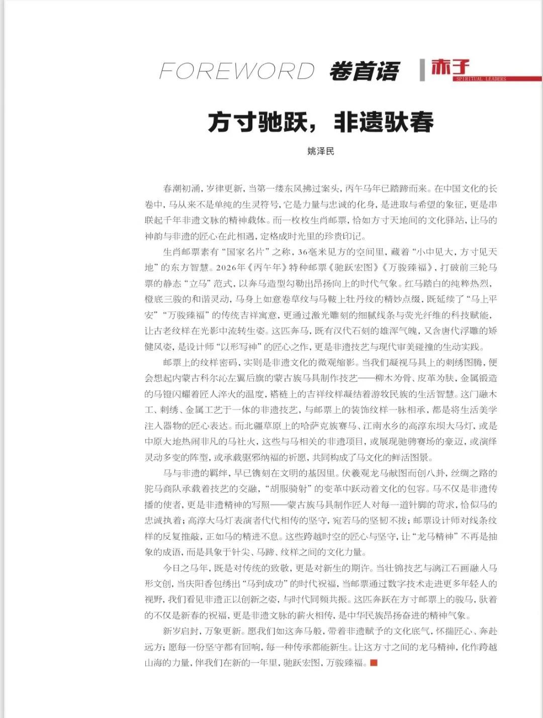 2026年1月《赤子》杂志封面人物———傅长敏。丙午年特种邮票《驰跃宏图》《万骏臻福》,打破前三轮马票的静态“立马”范式,是设计师“以形写神”的匠心之作,更是非遗技艺与现代审美碰撞的生动实践。为此,我特邀请中国工艺美术大师李文跃创作《伯乐相马》作为封二。