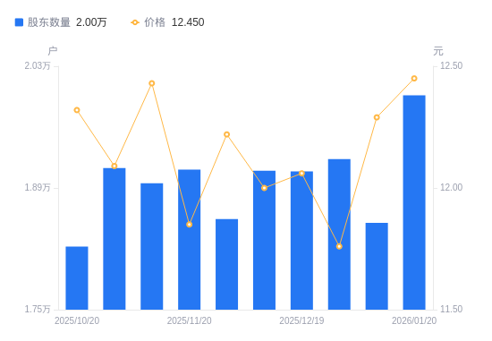 日期A股户数(户)流通A股户均持股数(股)户均持股市值(万元)2026-01-201996633414.1841.602026-01-091849836065.9344.332025-12-311923134691.2640.802025-12-191909134945.6642.142025-12-101909934931.0241.922025-11-281854235980.3443.972025-11-201911234907.2641.372025-11-101895435198.2543.752025-10-311912834878.0642.172025-10-201822536606.1845.10