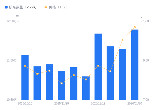 日期A股户数(户)流通A股户均持股数(股)户均持股市值(万元)2026-01-2012289914841.3017.262026-01-0911792415467.4216.722025-12-3111865115372.6513.562025-12-1912188315707.5714.422025-12-1011099117249.0214.322025-11-2811335616889.1414.492025-11-2011235917039.0113.722025-10-3111408016781.9614.872025-10-2011355016860.2914.602025-10-1011644116441.6815.08