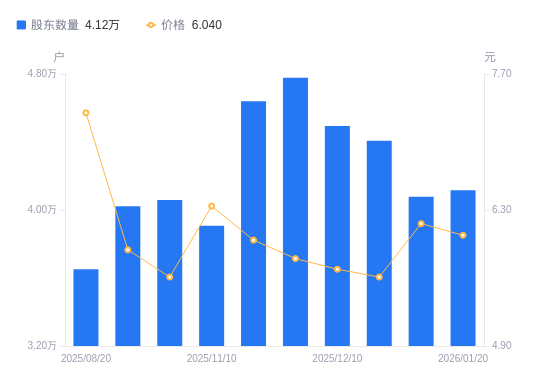 日期A股户数(户)流通A股户均持股数(股)户均持股市值(万元)2026-01-204116023668.0514.302026-01-104078023888.5914.722025-12-204407422103.2112.402025-12-104494021677.2812.332025-11-304778320387.5211.822025-11-204639720996.5512.582025-11-103907624930.3115.812025-10-204058324004.5513.472025-09-304021924221.8114.272025-08-203651326680.2719.48