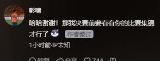 彭啸在社媒回应称:哈哈谢谢!那我决赛前要看看你的比赛集锦才行了。
