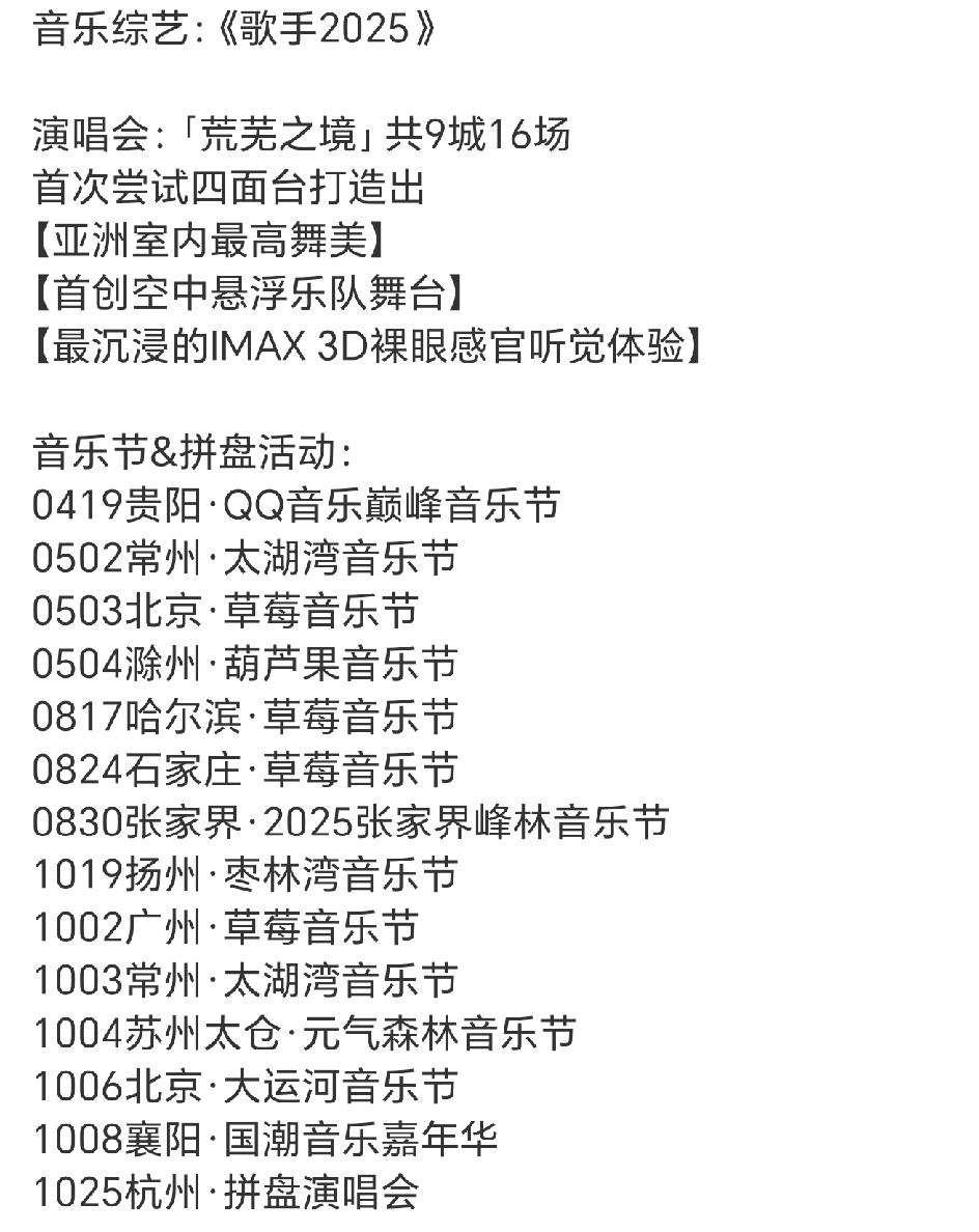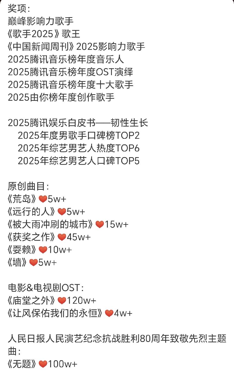 陈楚生2025的年终总结, 这一年他真的好忙啊! 先来看歌曲类的,OST《庙堂之外》战绩最佳120W+,其次致敬先烈主题曲《无题》100W+,再次是歌手冠军冠军夜的《获奖之作》45W+。 演唱会开了9城16场,如果不是因为要参加歌手,可能开的要更多! 音乐节参加了十几个,其中10月份就有7场演出,真是超强度的工作狂啊! 奖项获得了七八个,晚会和典礼也有七八个,且都是重量级的,从地方卫视到央视,从大湾区到金鸡奖再到中国新闻周刊,各个领域的认可和被看见,这一年没白干[大笑]! 要说参加的综艺,除了音综《歌手》之外还有两个团综,就是《快乐再出发》和《快乐老友记》,由此可以看出陈楚生真的是很专一的一个人,专注于音乐,就像他说的那句话,音乐,难道不能打动你吗?陈楚生