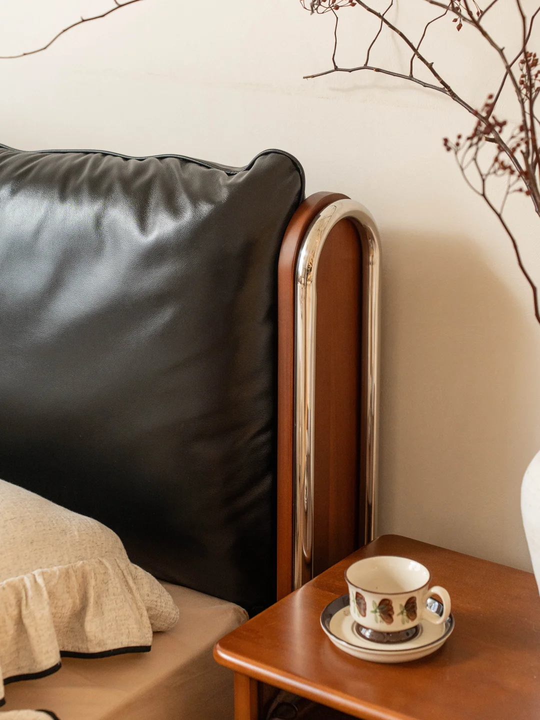 以软包 + 实木 + 不锈钢的巧妙混搭