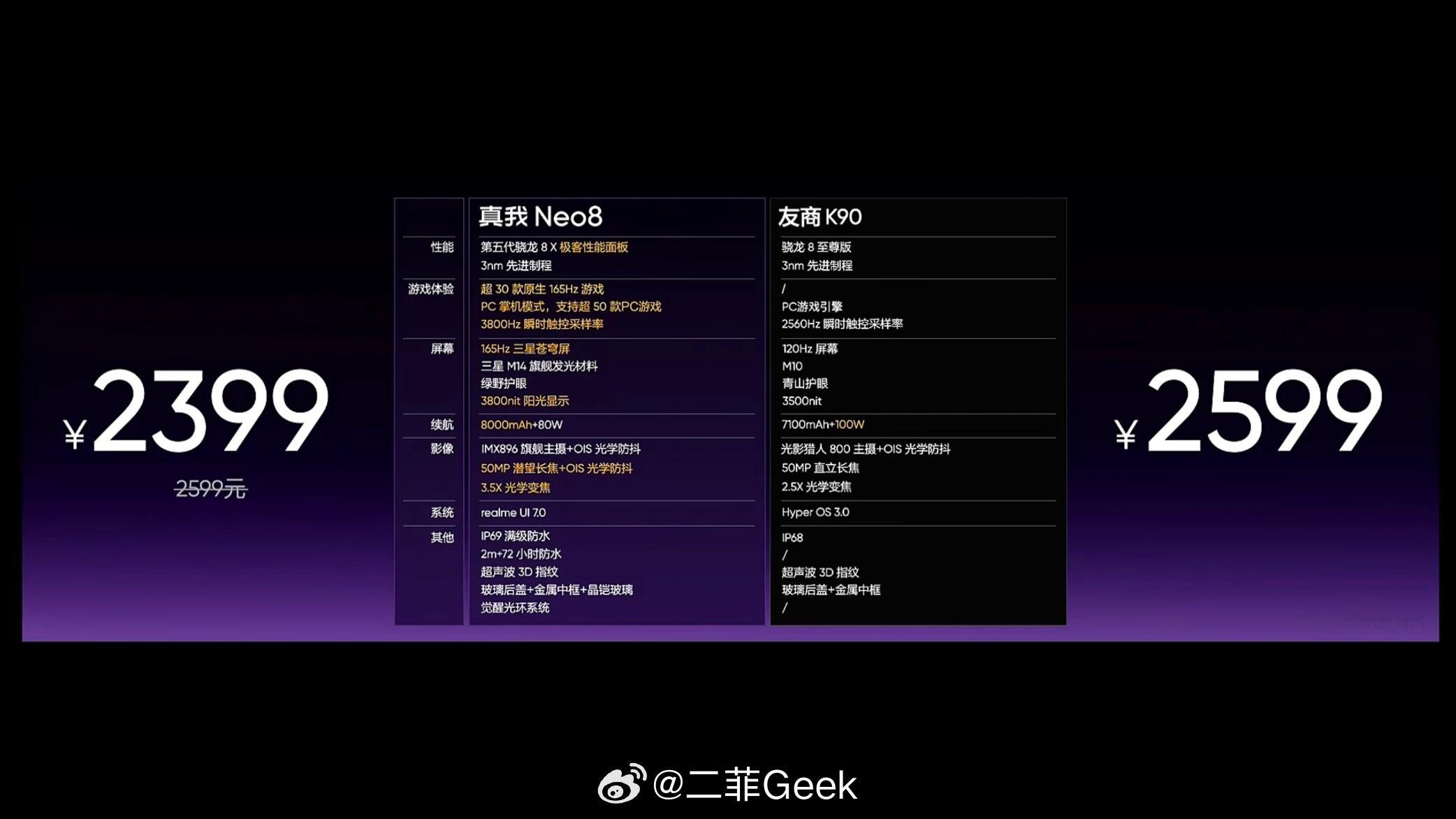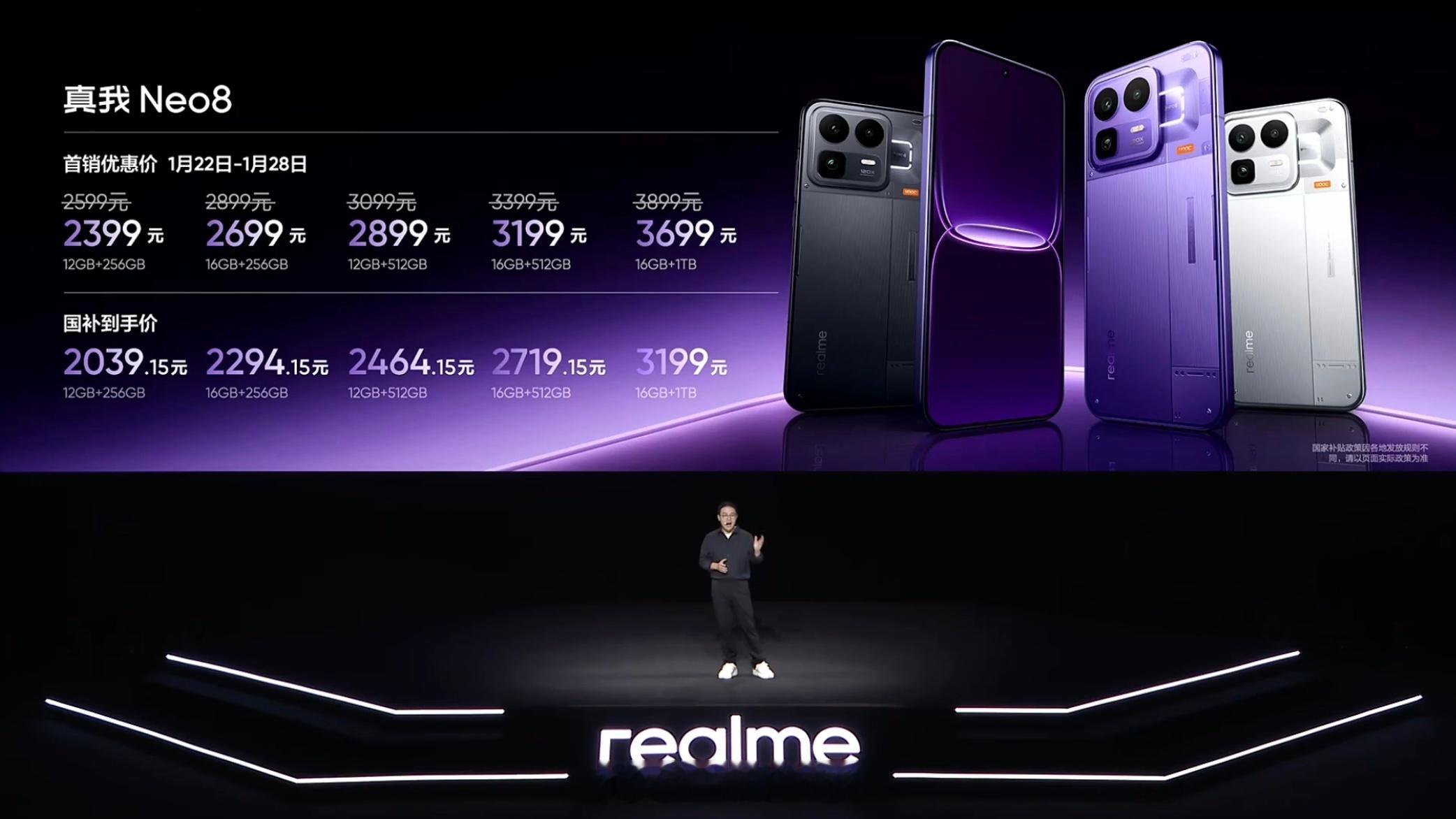 真我Neo8价格来了!12GB+256GB:首销价2399元,国补到手价2039.15元16GB+256GB:首销价2699元,国补到手价2294.15元12GB+512GB:首销价2899元,国补到手价2464.15元16GB+512GB:首销价3199元,国补到手价2719.15元16GB+1TB:首销价3699元,国补到手价3199元