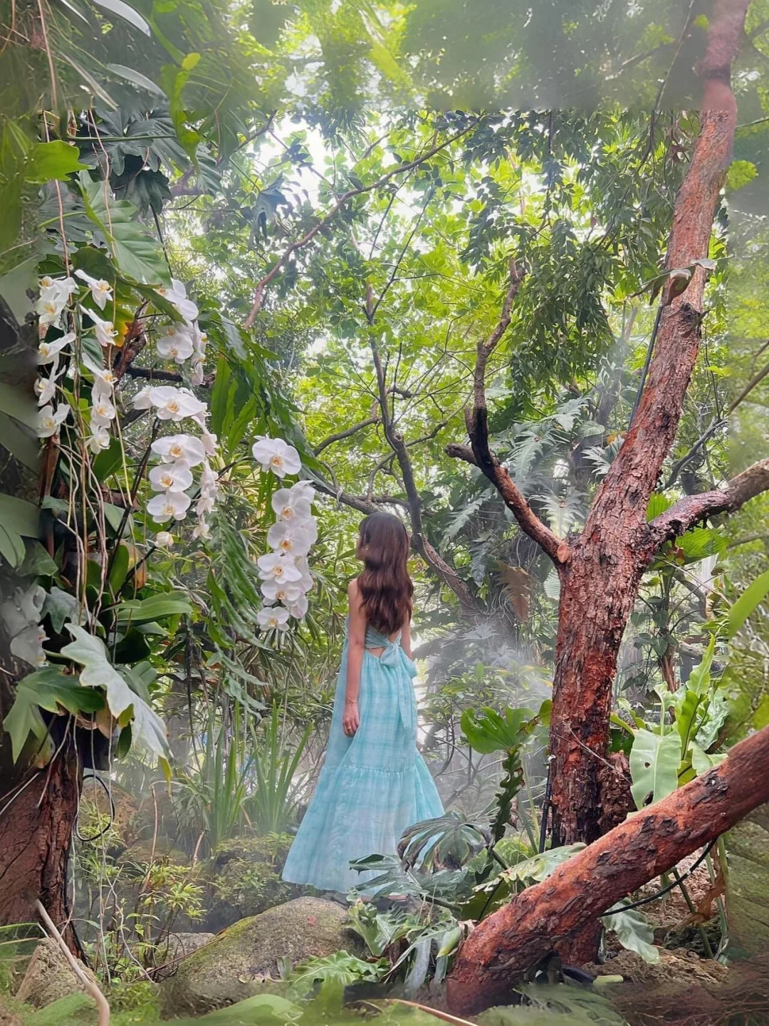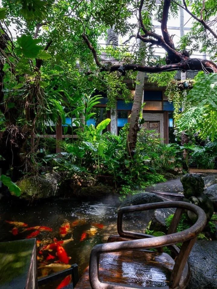 这家简直就是烟雾缭绕的人间仙境,郁郁葱葱的热带雨林,漂亮的鲤鱼池塘和瀑布,阳光透过植物的空隙照射下来形成美妙的丁达尔现象
